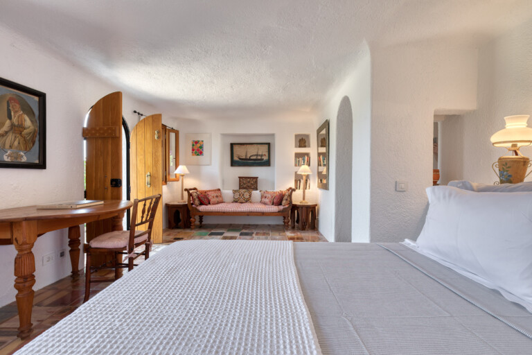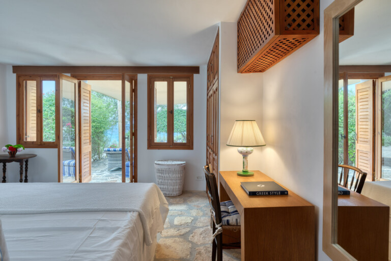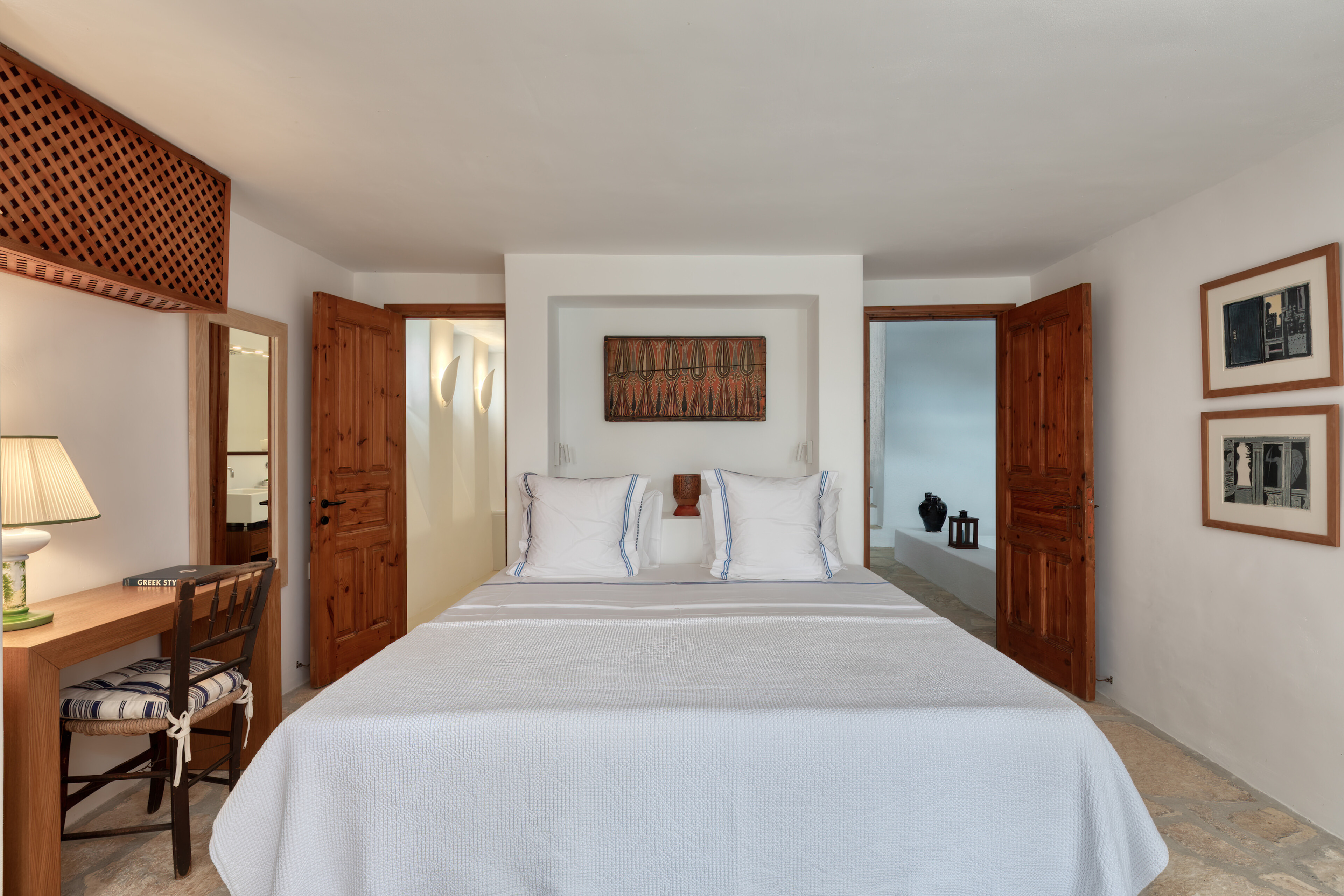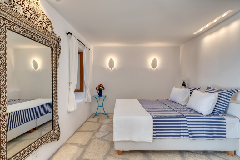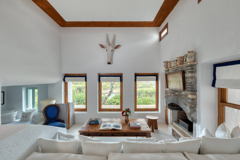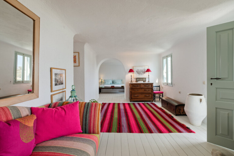 The living spaces are characterised by an eclectic mix of colourful textiles and artistic touches, creating a warm, welcoming environment. Sunlight streams through large windows and French doors, beckoning you to step out onto the inviting patio. Sink into comfortable blue-striped lounge chairs and lose yourself in the mesmerising expanse of the Aegean Sea.