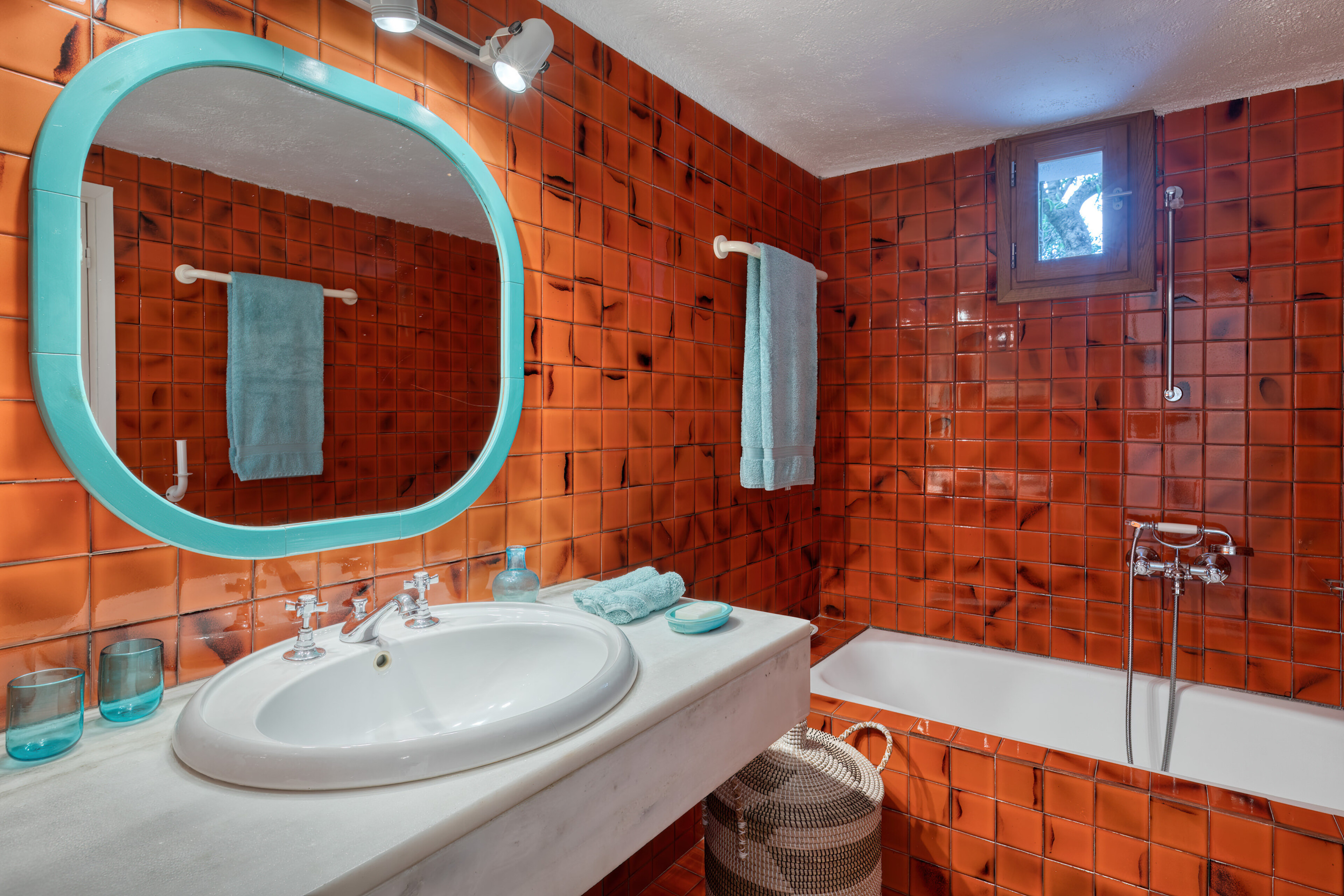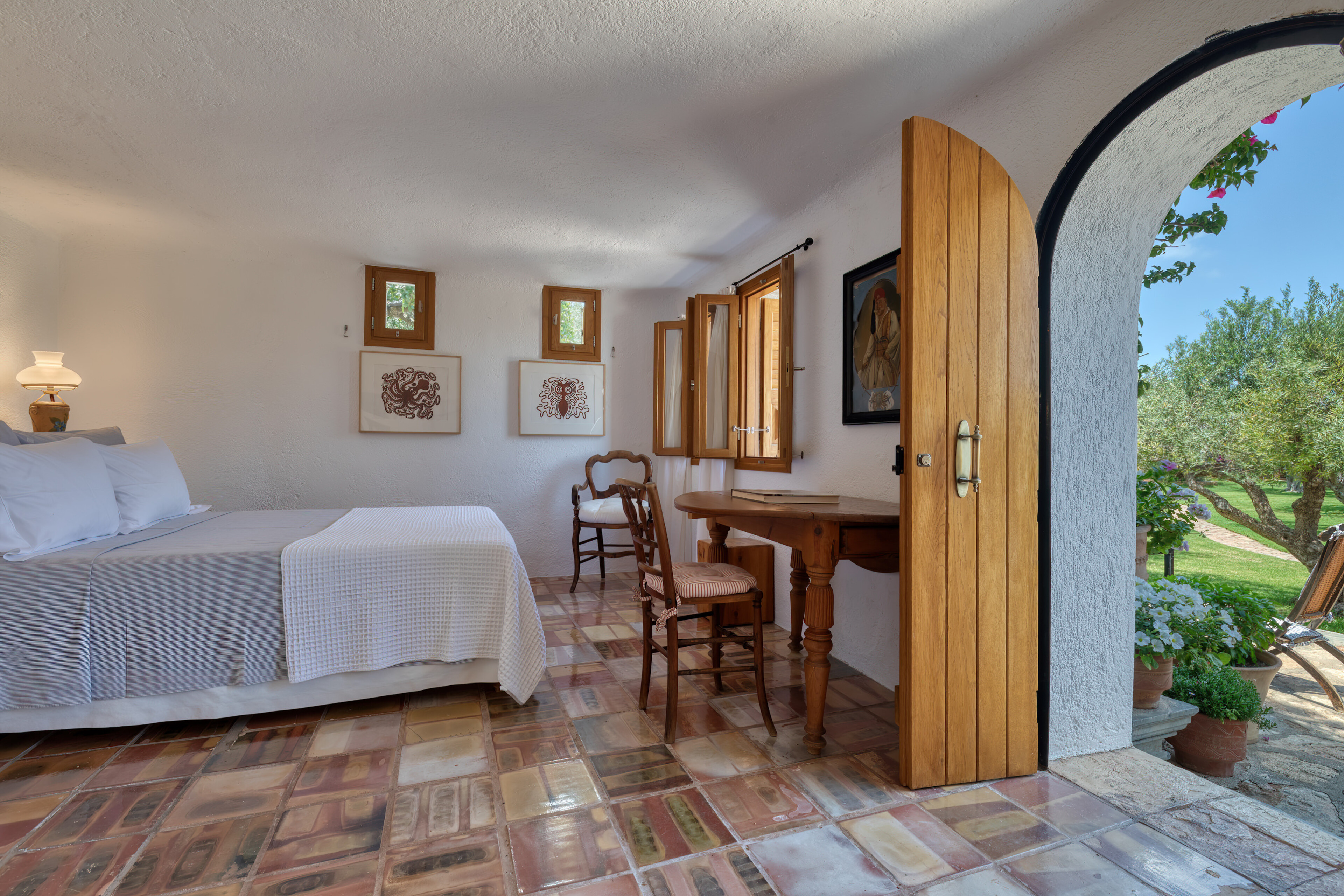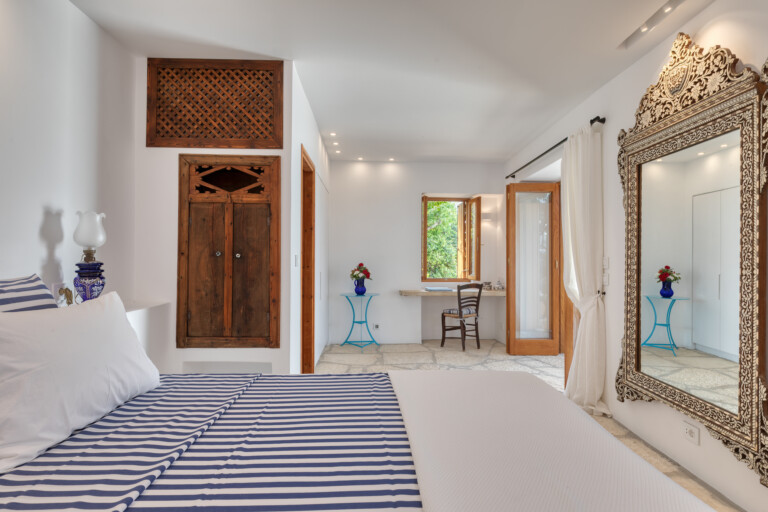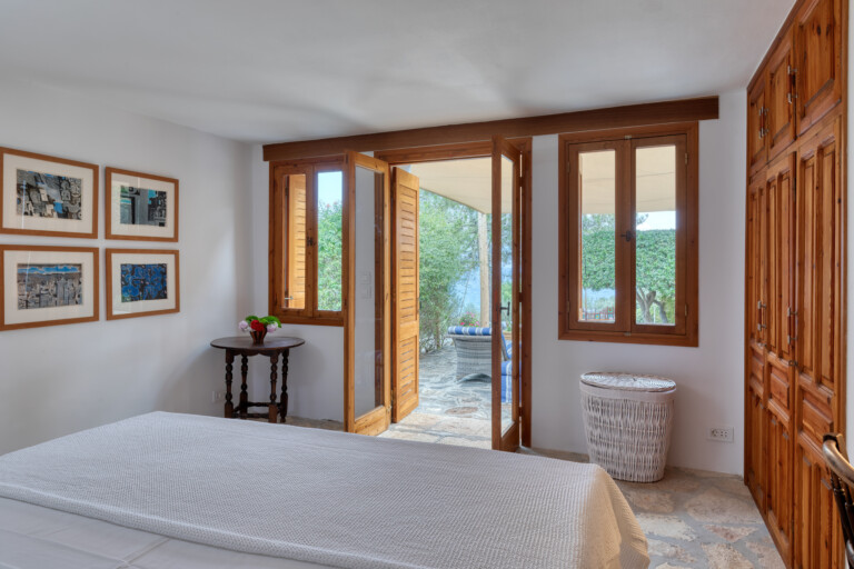 The living spaces are characterised by an eclectic mix of colourful textiles and artistic touches, creating a warm, welcoming environment. Sunlight streams through large windows and French doors, beckoning you to step out onto the inviting patio. Sink into comfortable blue-striped lounge chairs and lose yourself in the mesmerising expanse of the Aegean Sea.