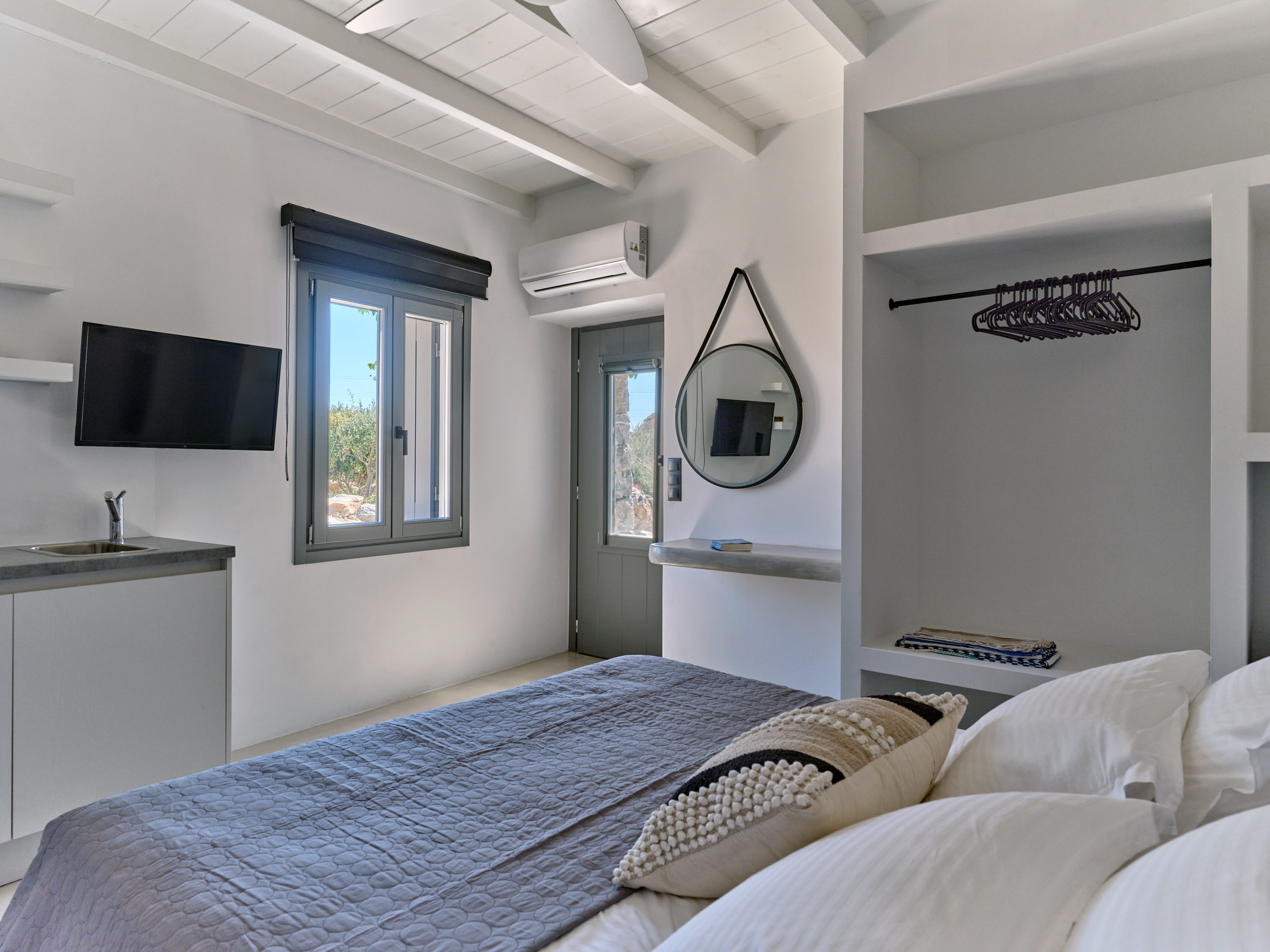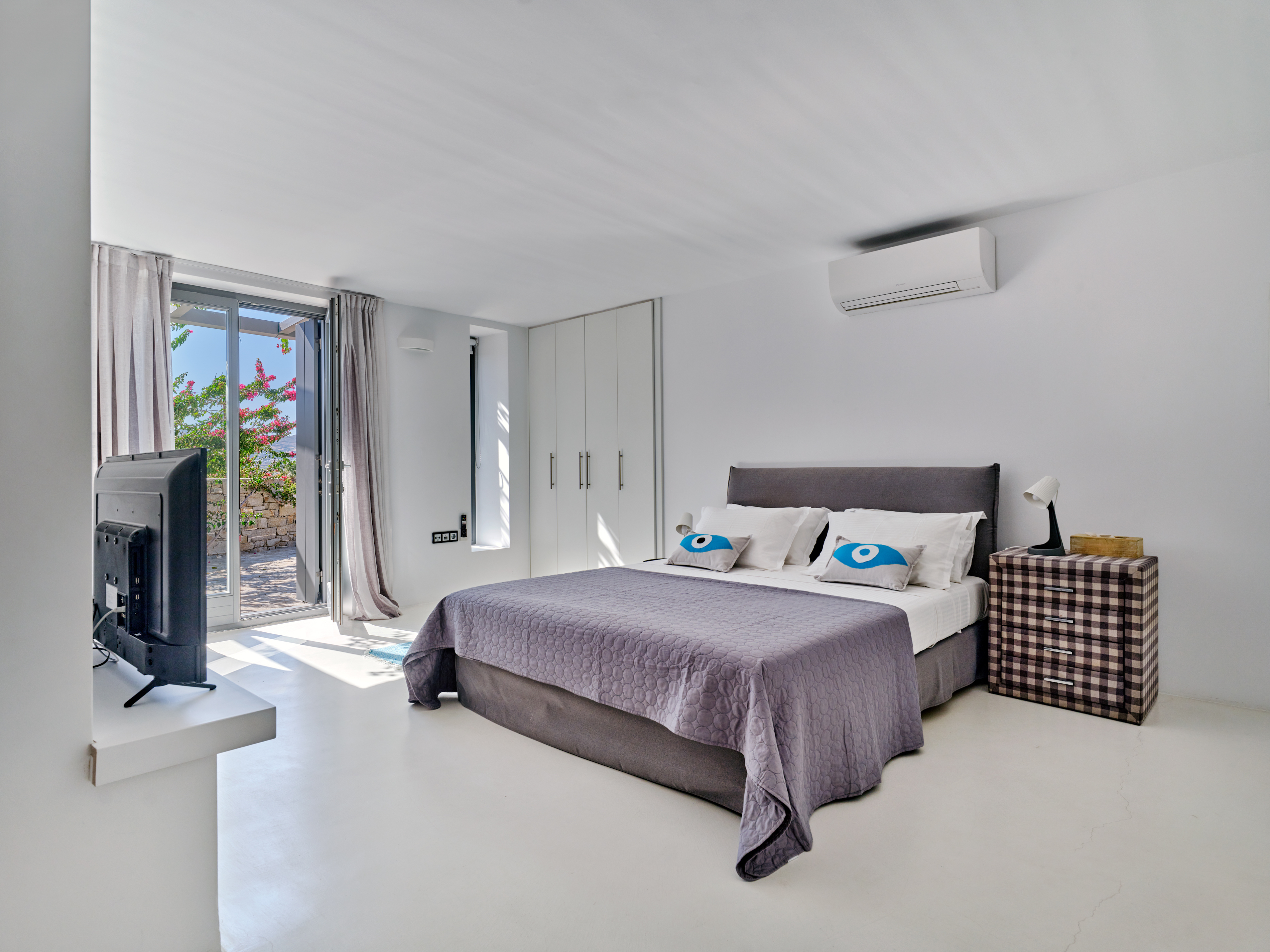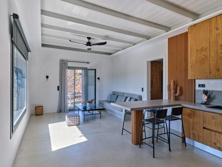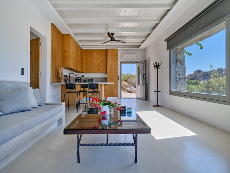 The charming villa, offers a real blend of modern comfort and Cycladic charm. The main house features an open-plan living area with a fully equipped kitchen, indoor dining space, and a stylish lounge with direct access to the outdoor pool area. The villa boasts multiple spacious bedrooms, each with en-suite bathrooms, private balconies, and panoramic views of the Aegean Sea.