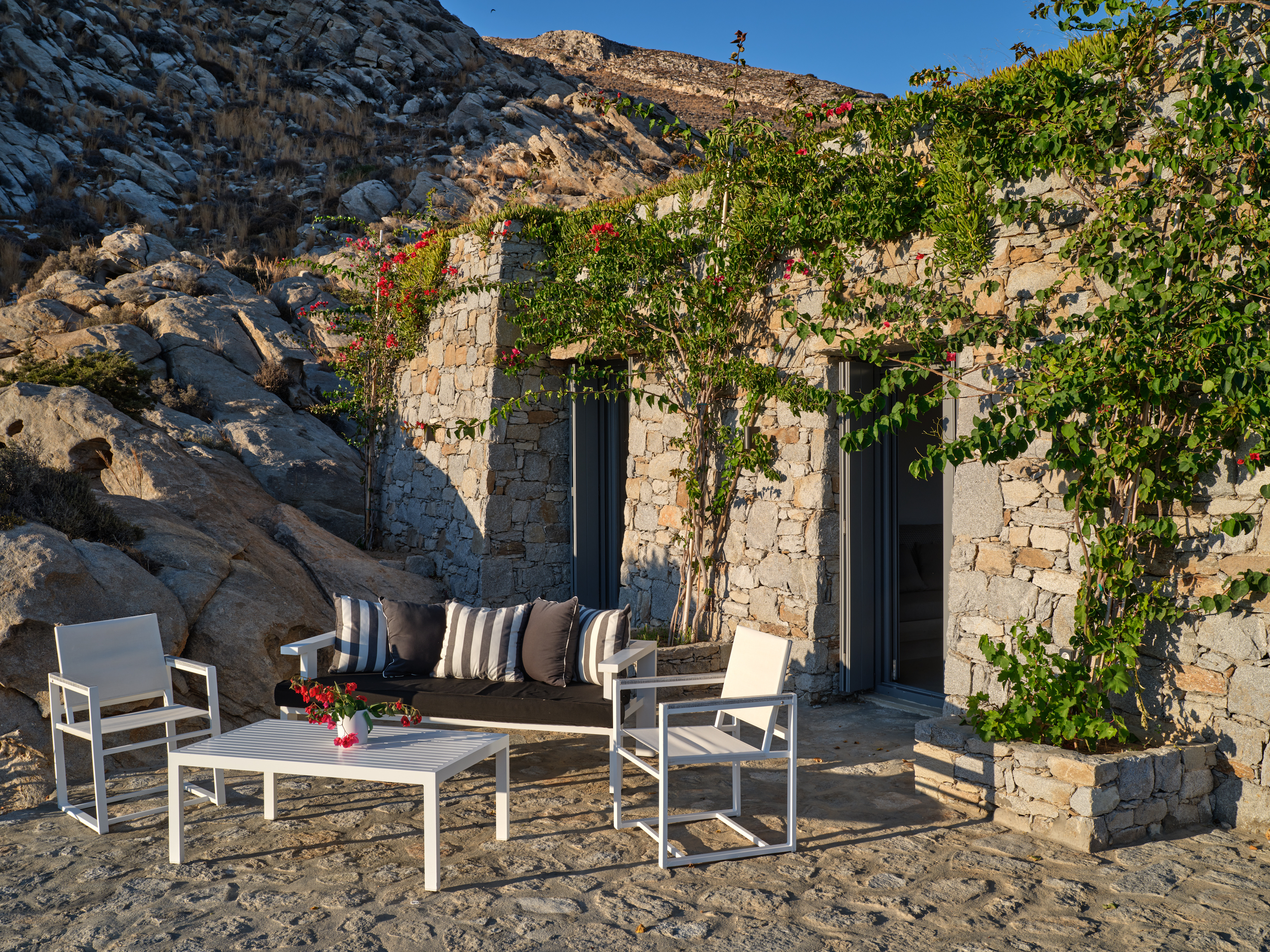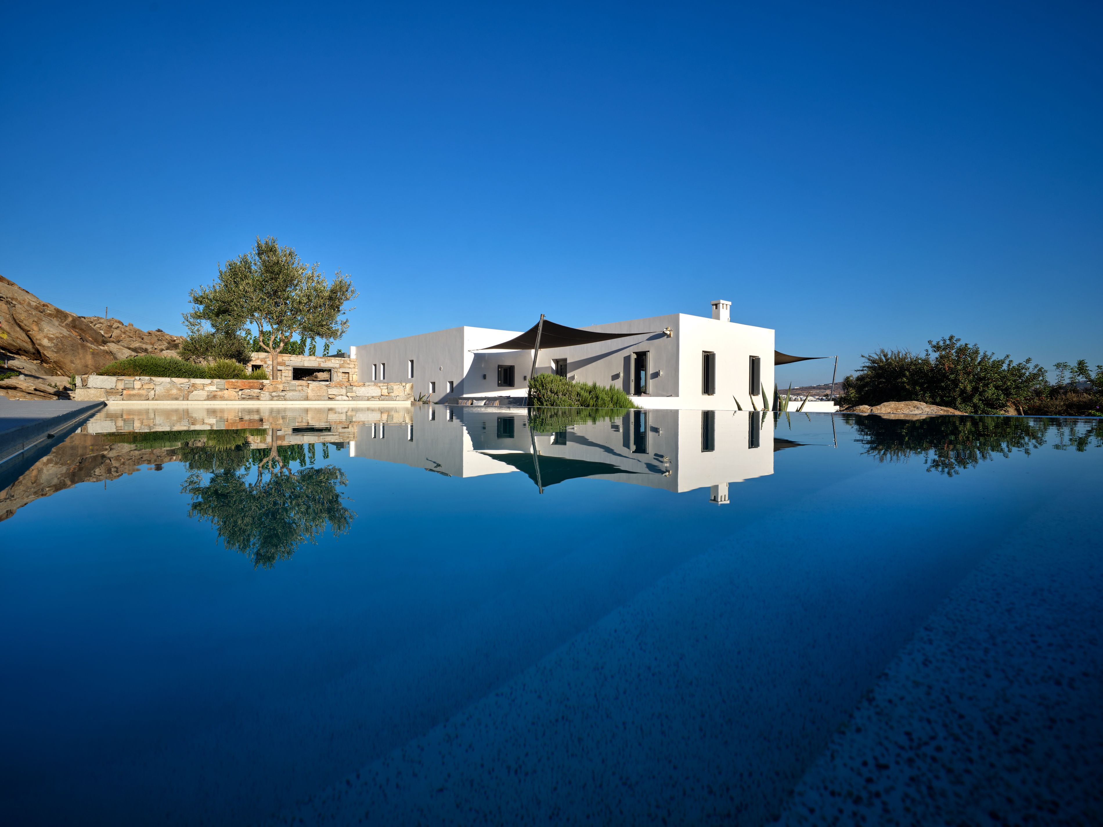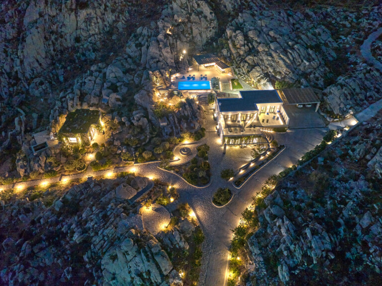 Nestling into a rocky landscape by the sea it offers a unique atmosphere and combination stunning views. The stone emerges discreetly, as if an extension of the terrain creating a warm living environment. The beautifully appointed interiors offer serene living and a sensation of complete tranquillity.