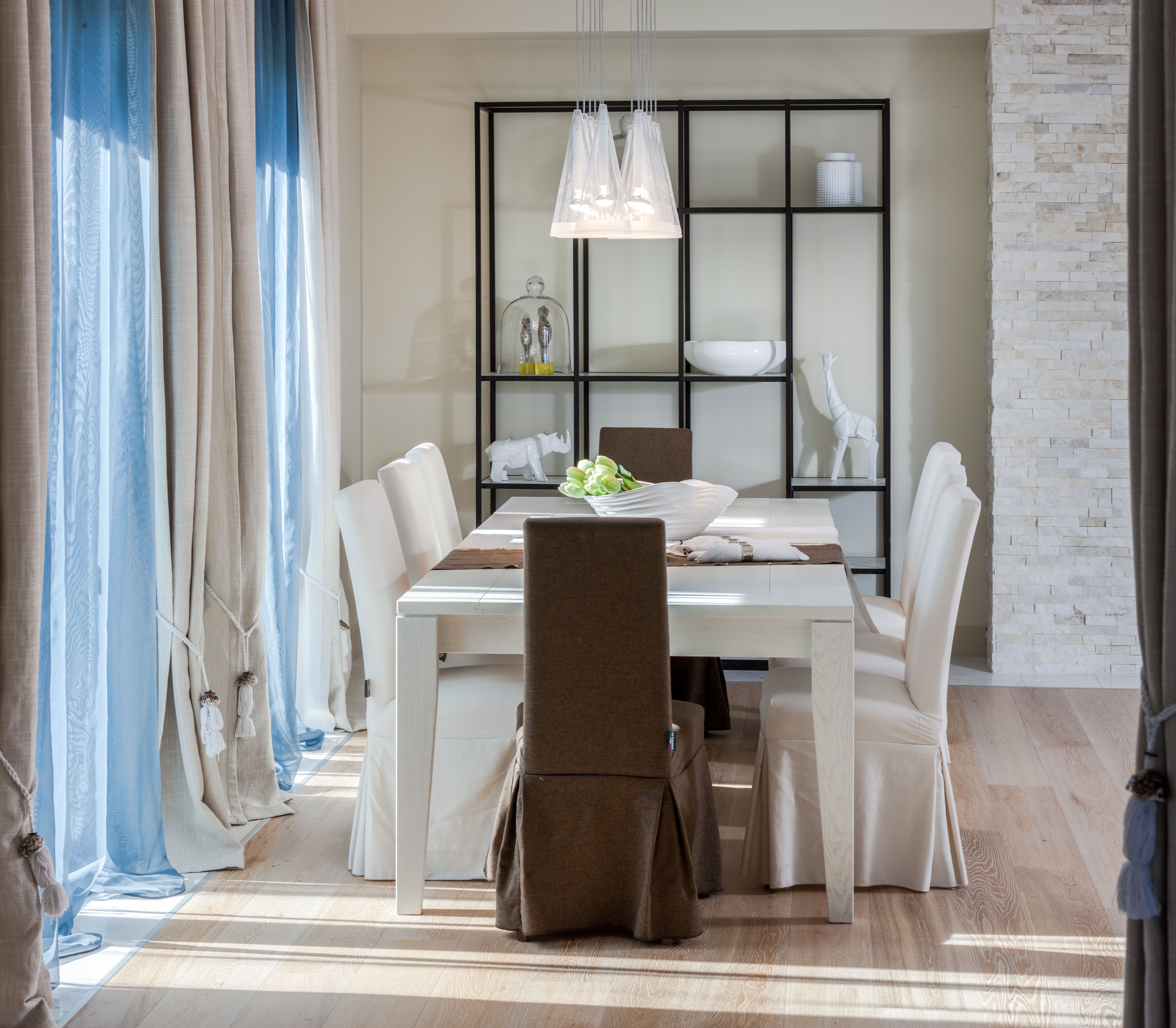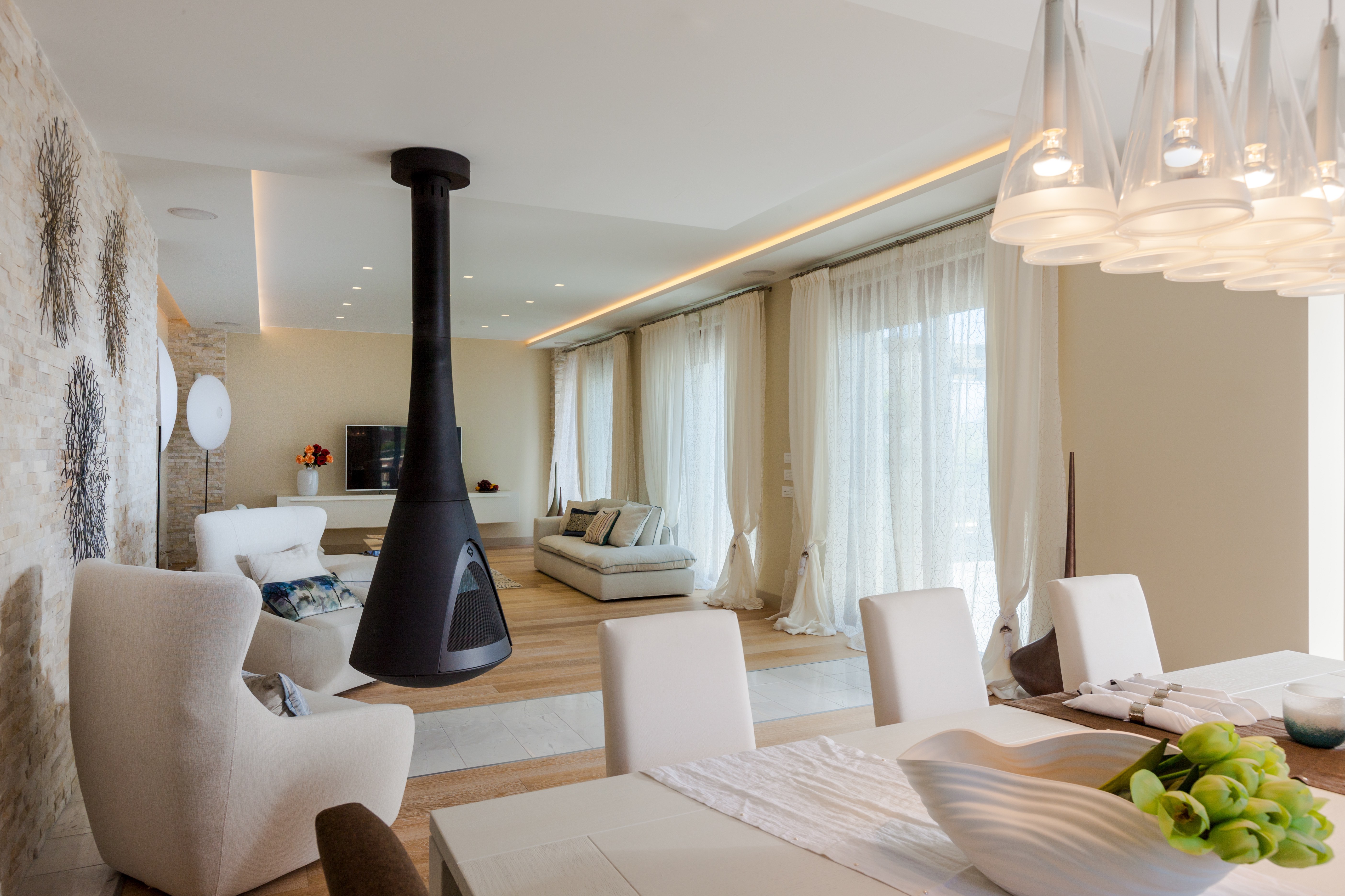 The living areas are bright and airy, with vaulted ceilings and wooden floors. White walls and furniture create a restful feel that’s accented by colourful touches. For cosier evenings, there are sitting areas around the original fireplace.