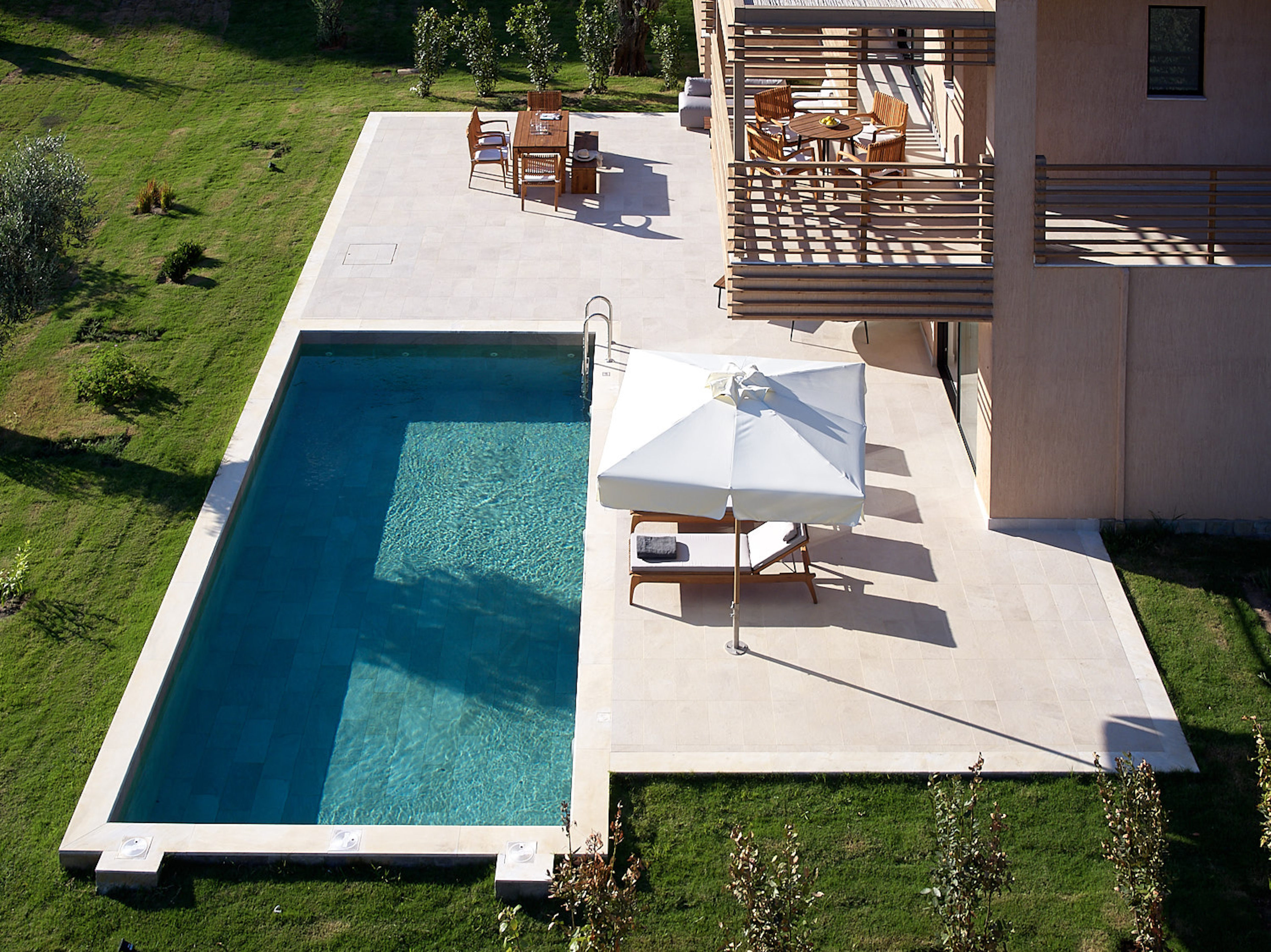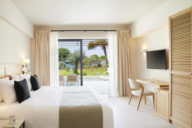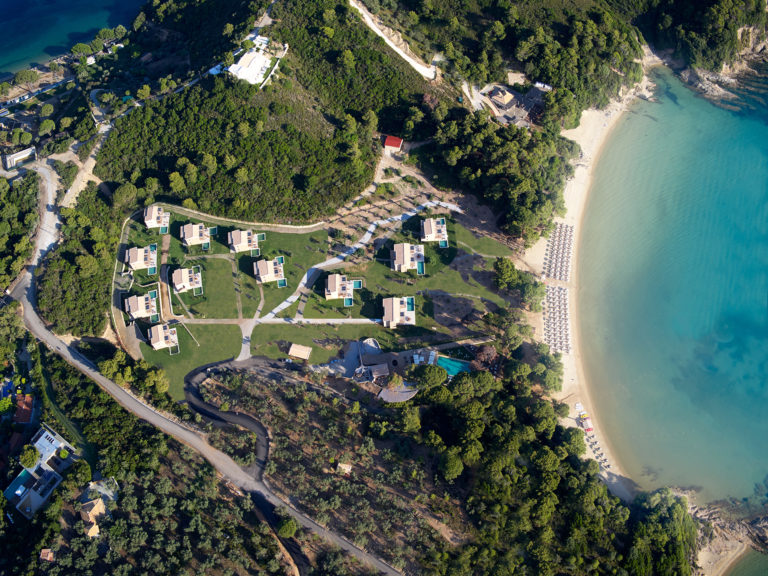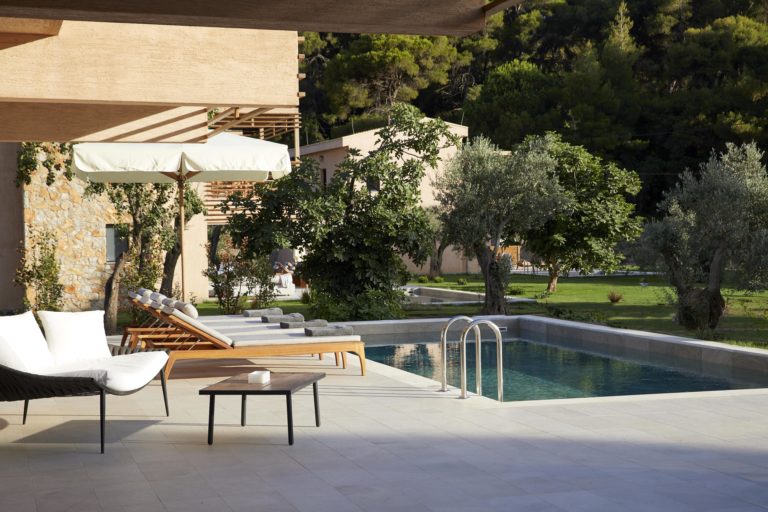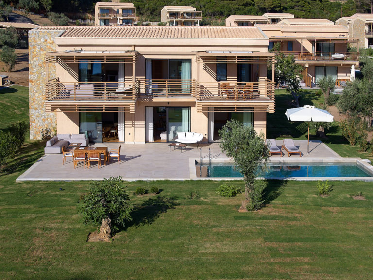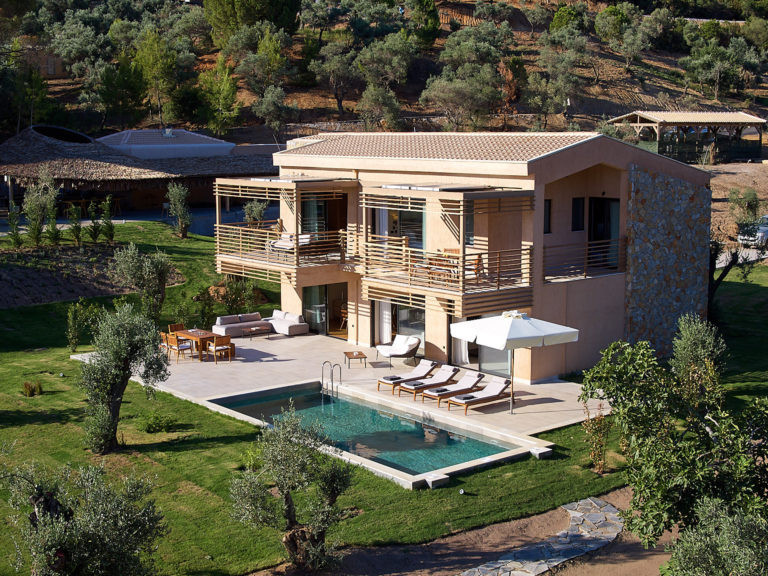Cornelia a 200 sqm villa-suite, set in a green scenery of olive trees, pines and cultivated wild flora, in front of the beach, offers a true connection with nature. It may accommodate up to eight people and two children in its four bedrooms and features a 36sqm pool, with 100sqm terrace on the ground floor and a 32sqm veranda on the first floor. A beautiful sitting area, kitchen and dining area, look out over the sea that stretches out in front of Big Banana beach.