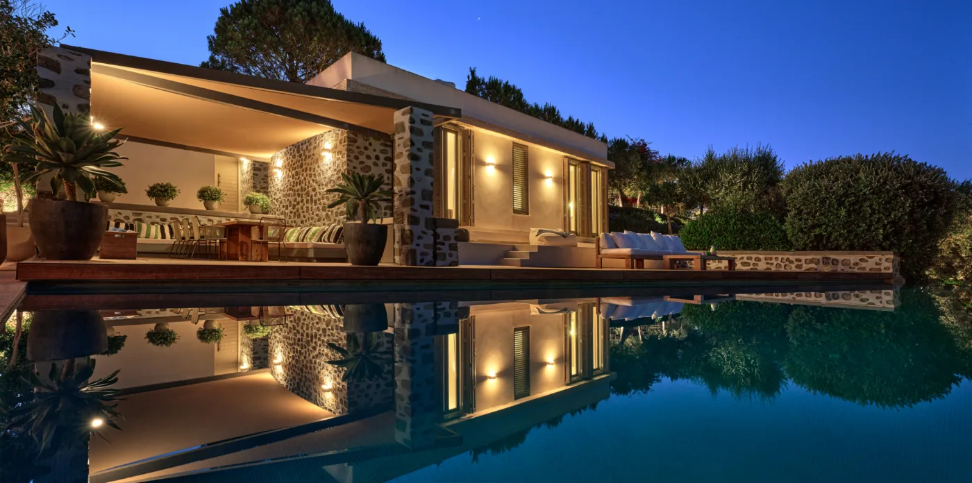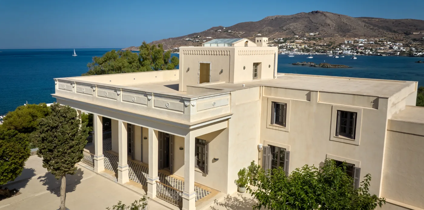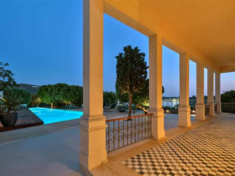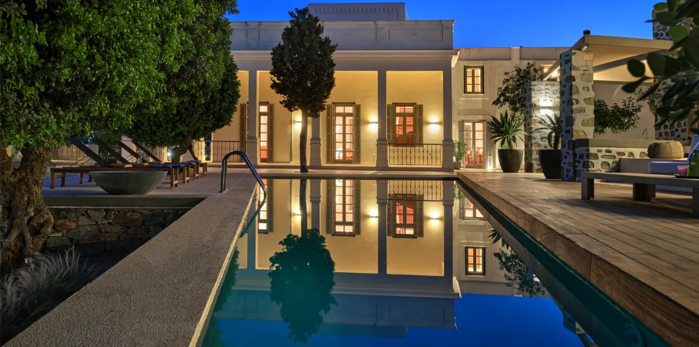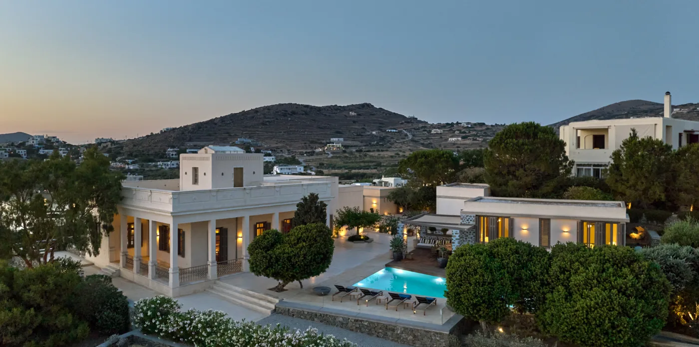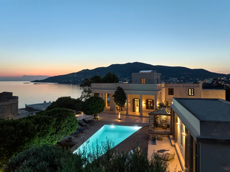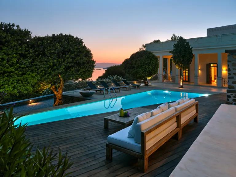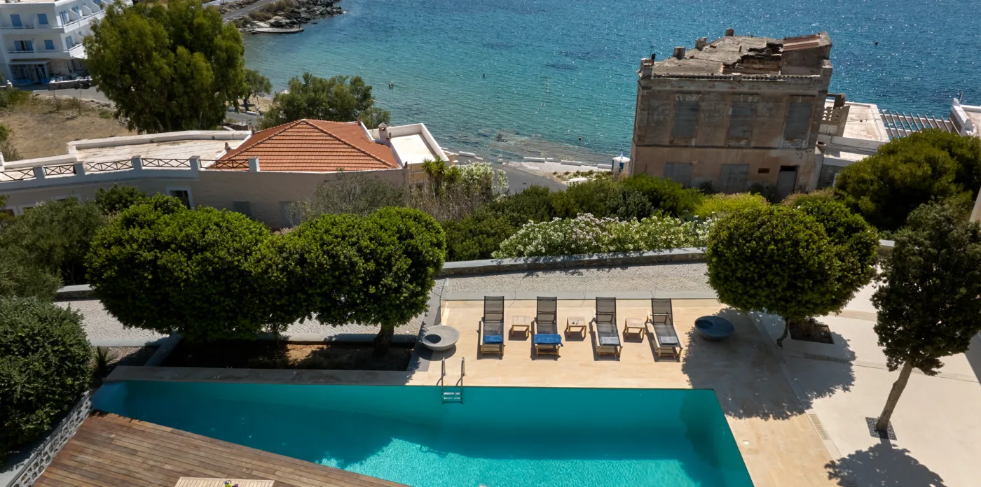 In one of the most prestigious locations on the island, Poseidonia, Eloise will enchant you at first sight. The stunning mansion has been carefully renovated by its owners to combine minimalism, art deco details and neoclassical features in both its indoor and outdoor areas.