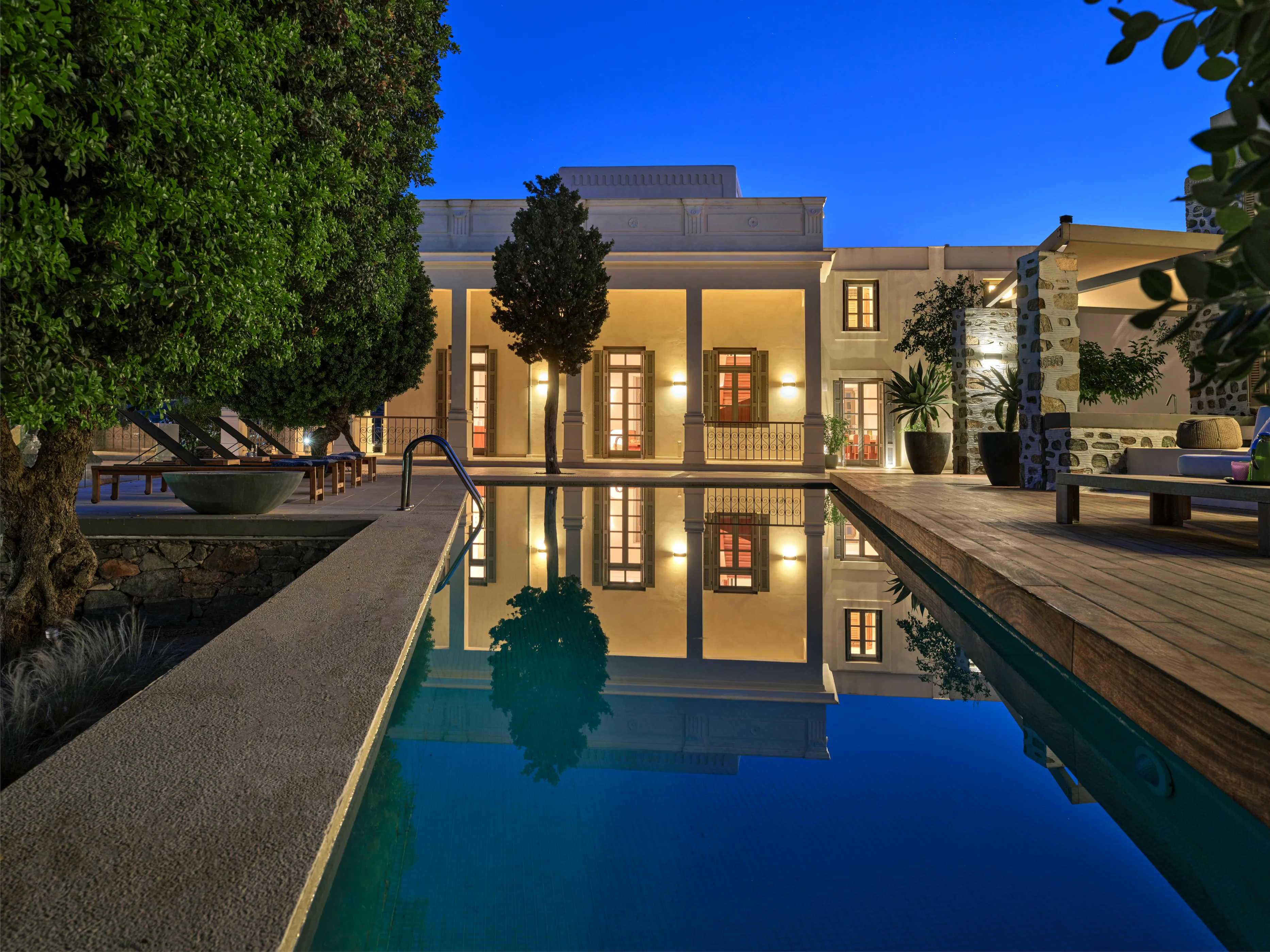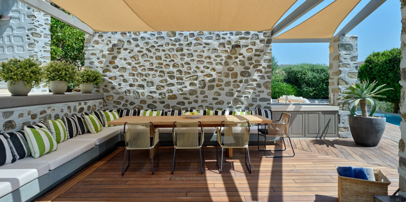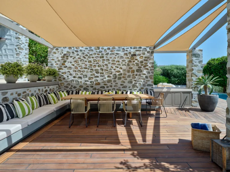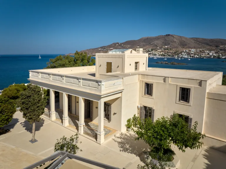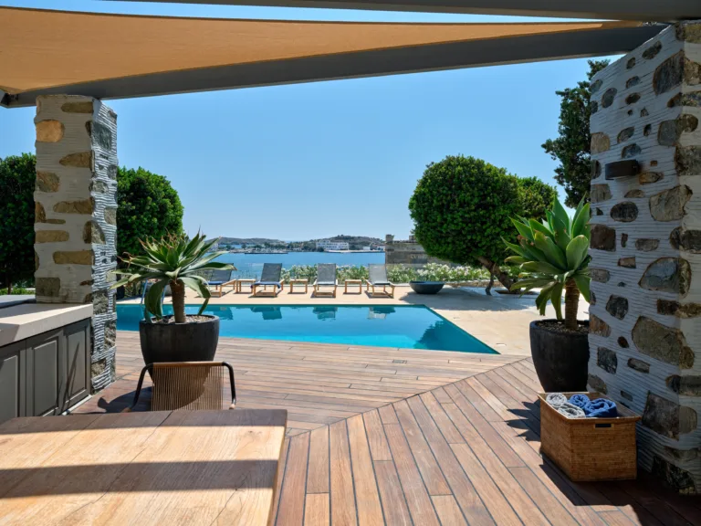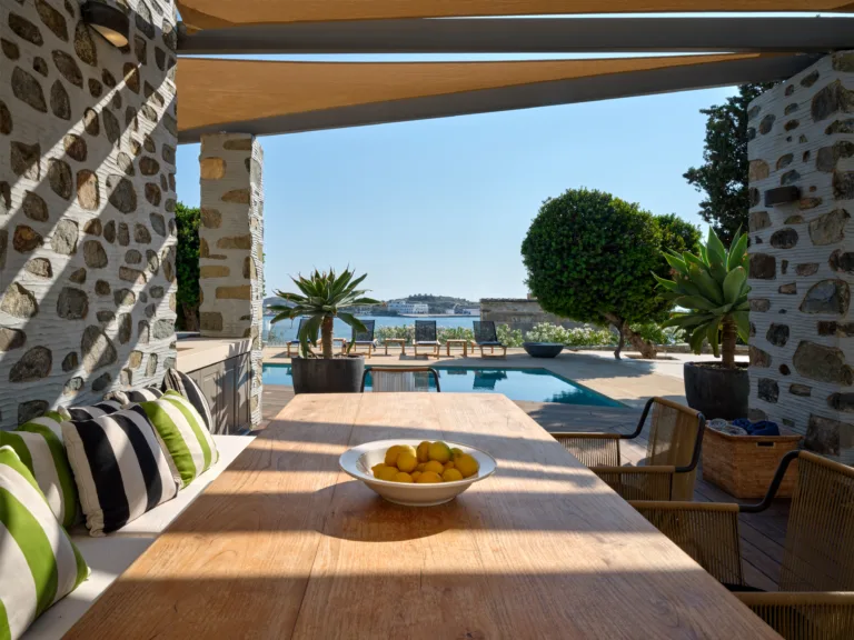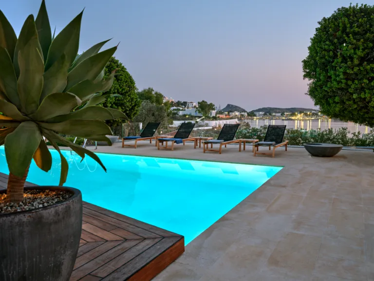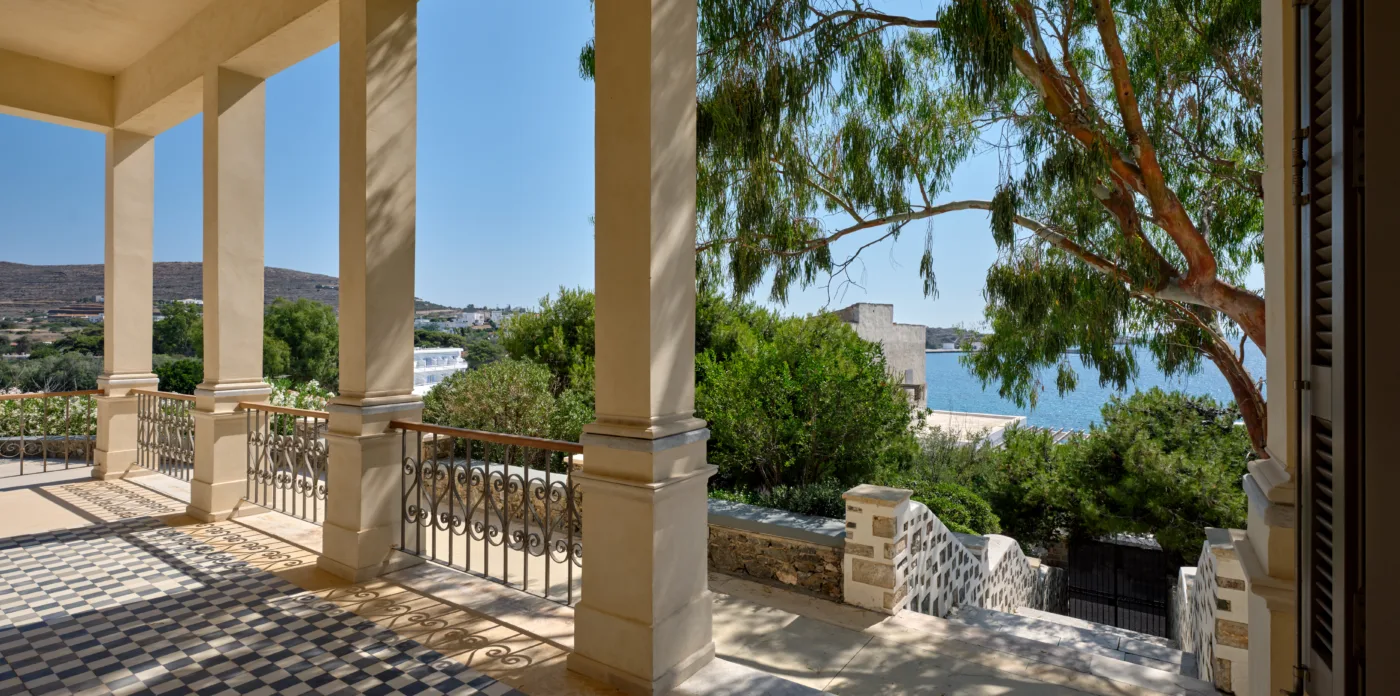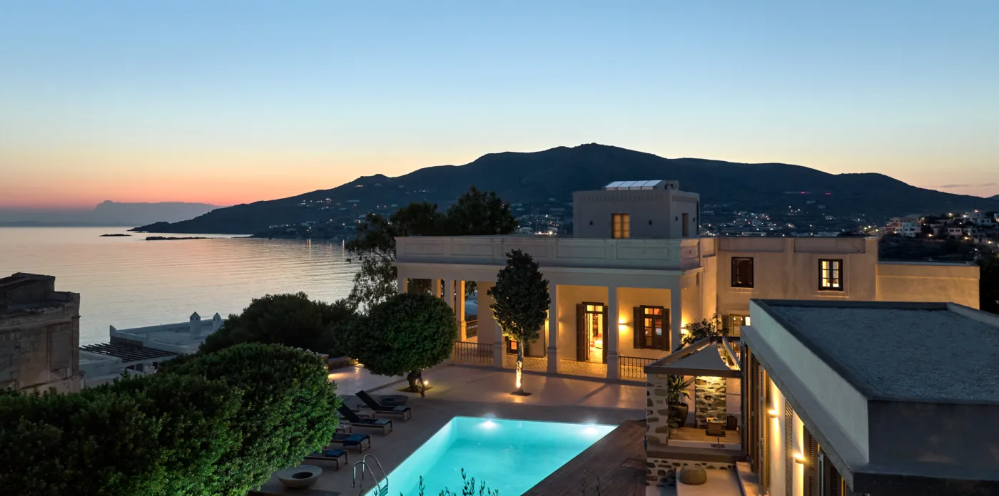 In one of the most prestigious locations on the island, Poseidonia, Eloise will enchant you at first sight. The stunning mansion has been carefully renovated by its owners to combine minimalism, art deco details and neoclassical features in both its indoor and outdoor areas.