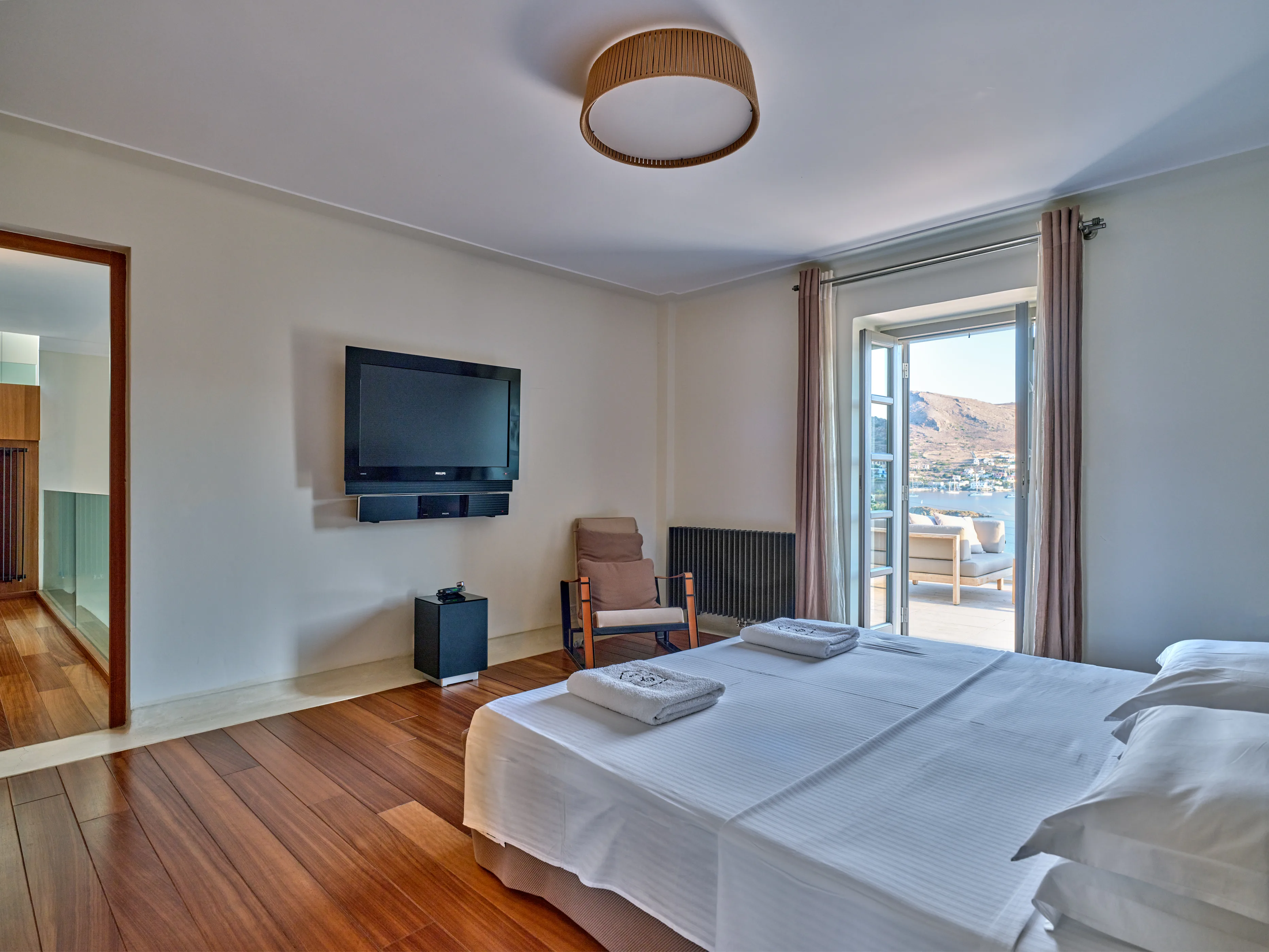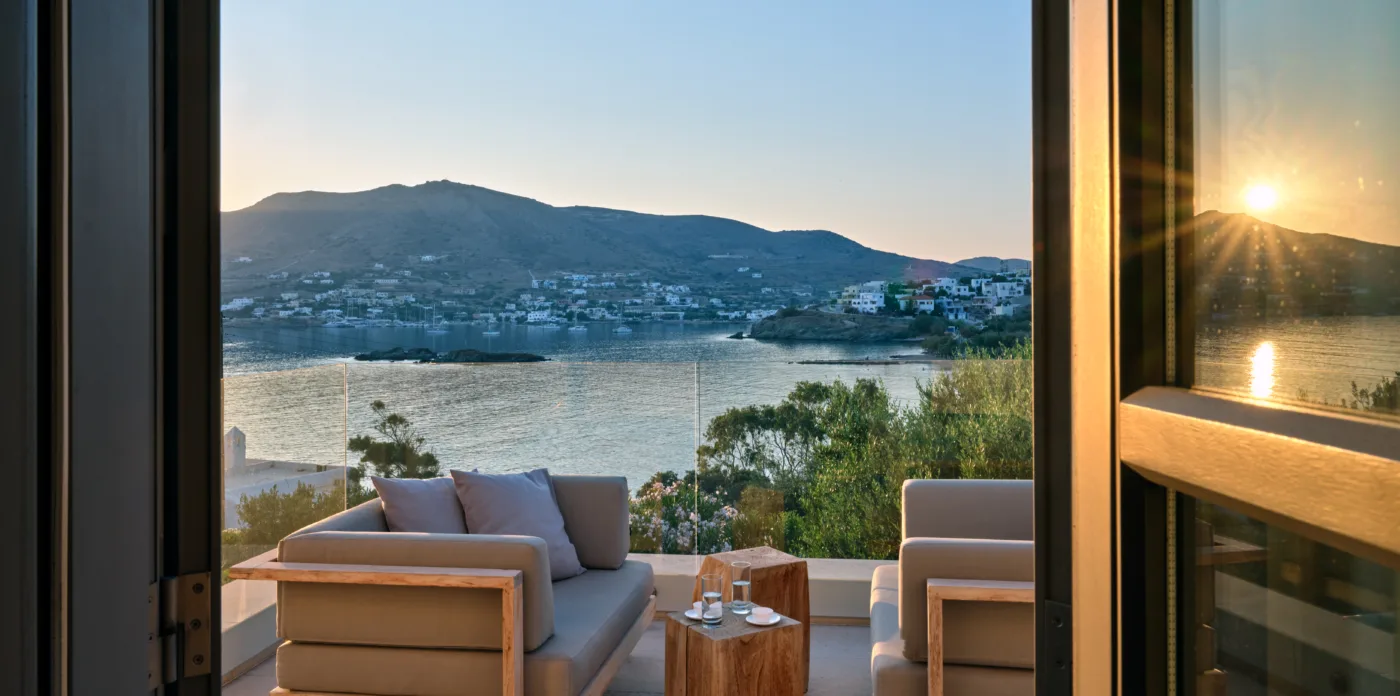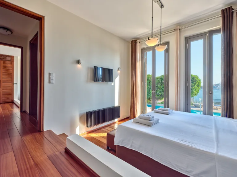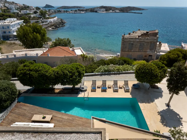 Only 1 minute walk from a sandy beach and 15 minutes away from the colourful 19th-century city of Ermoupolis, this villa boasts high aesthetics, , privacy and breathtaking sea views from all its areas.