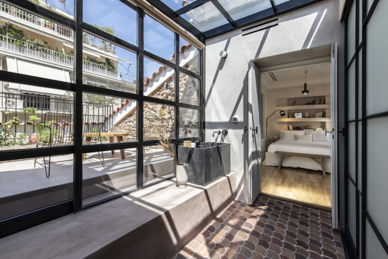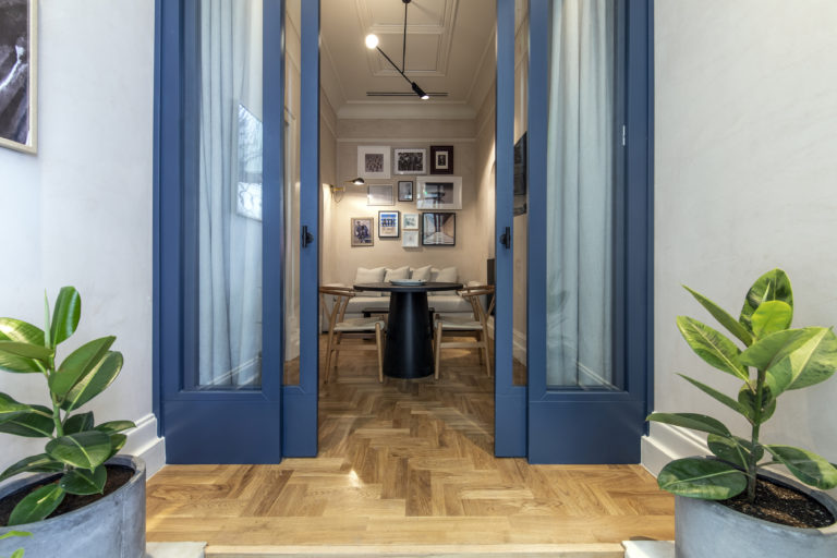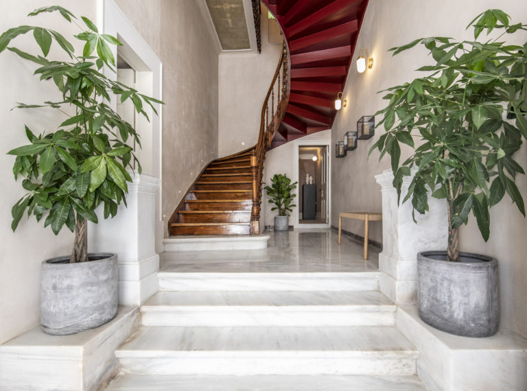 The concept behind the building’s modern revival went hand in hand with a deep respect of its unique character and a renegotiation of its neoclassical elements. The access to most of its spaces was re-organised to re-orientate and diversify the existing layout, using traditional methods and natural materials. Some of its most impressive elements such as the tall, hand-painted ceilings, the wooden staircase, the vintage mosaics will greatly inspire you.